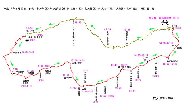 久保駐車地点 3:26 --砂防堰堤付近 4:13 -- 牛の背三角点 (6:05-6:13) --- 天狗塚山頂 (6:41-6:54) -- 天狗峠7:06 --- お亀岩 7:23 -- 西熊山 ( 7:43-7:49 ) -- 三嶺(8:40 -8:57 ) --- カヤハゲ 9:29 -- 白髪山分岐 9:56 --白髪避難小屋 10:04-- 1700m三等三角点 10:28 --1732m標高点 (10:48-11:02) --石立山分岐 11:29 --高の瀬 三角点 (11:45 - 11:54 ) --荒廃小屋 12:11---丸石避難小屋 12:24 -- 丸石 (12:47-13:04) --スーパー林道分岐 13:16 -- 次郎笈 (13:59-14:11) -- 剣山 ( 14:46-15:00 ) --剣神社 15:40 --- 見ノ越 自転車デポ地点 15:46