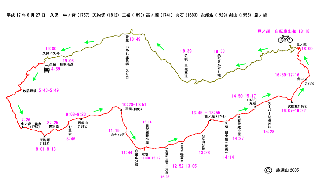 HOME > 山行記録 >牛ノ背(1757) 天狗塚(1812)三嶺(1893)次郎笈(1929)剣山(1955)>平成17年8月27日>概念図拡大