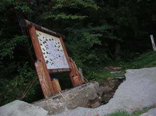 2005年6月25日に きた時は きちんとあった 案内看板は 足下を剔られて 大きく傾いていた。
