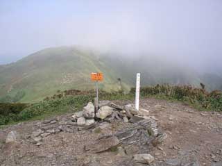 三嶺山頂 「13.2度 5-6m北風 ガス 水滴をふくんだガスで 衣服が濡れる」