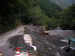 西熊溪谷沿いの道路は 川に削り取られて 一部 狭くなっているところがあり 応急復旧工事中であった。