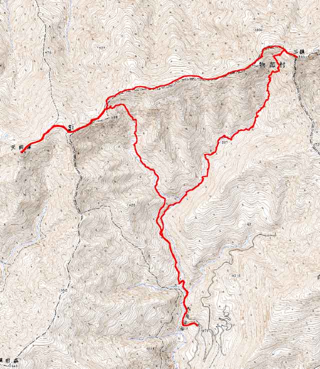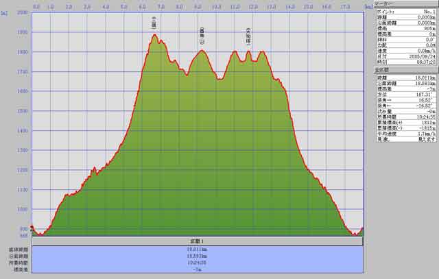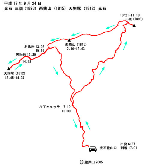 光石登山口 6:37 -- 八丁ヒュッテ 7:19 ---三嶺山頂 (10:21-11:10) -- 西熊山 (12:10-12:43) ---お亀岩 13:02 --- 天狗峠 13:30 --- 天狗塚山頂(13:45-14:37)-- 天狗峠 14:53 -- お亀岩 15:16 ---八丁ヒュッテ 16:30 --- 光石登山口 17:01