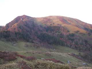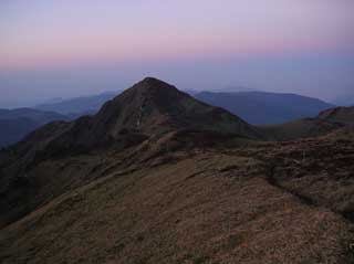 天狗峠に近づくと 明るくなる。峠では 早朝の天狗塚 牛ノ背など見える。
