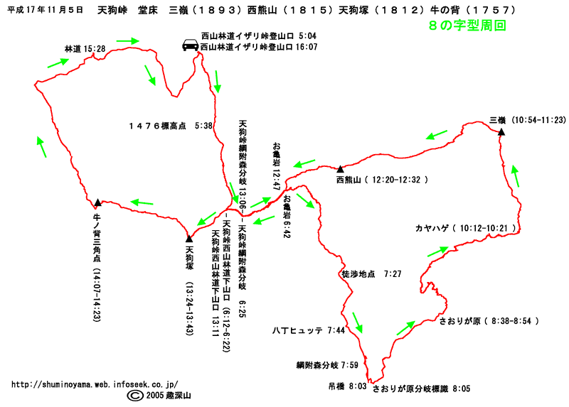 西山林道駐車地点5:17発--西山林道イザリ峠登山口 5:31 ---1476標高点 6:12---天狗峠西山林道下山口 6:57---天狗峠綱附森分岐 7:08--お亀岩 7:25--お亀岩避難小屋 7:26---徒渉地点 8:09--- 八丁ヒュッテ 8:26 --堂床 綱附森分岐標識 8:37 ---堂床 吊橋 8:41--堂床 さおりが原分岐標識 8:43---さおりが原 9:21 ---水場 トチノキ 9:37--- ケヤキザコ 分岐 9:50--フスベヨリ分岐9:53--カヤハゲ10:48---三嶺 (11:40-12:01)---西熊山( 13:04-13:16 )---お亀岩 13:34---天狗峠 綱附森分岐13:57--天狗峠西山林道下山口 14:03 -- 天狗塚 (14:20-14:34)--牛ノ背三角点 15:05-----林道16:03---西山林道駐車地点 16:21着
