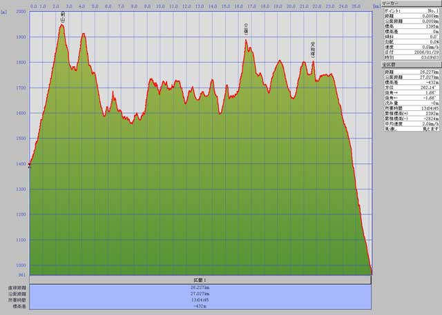 累計歩行距離 27.027km 累計標高差 2392m