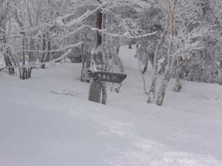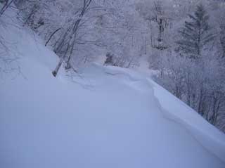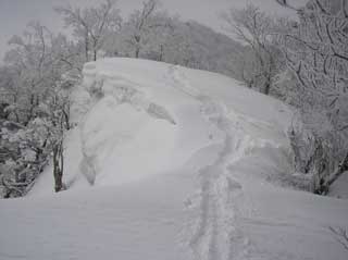 新雪の層が硬い雪面上に乗って いやらしく ふわふわしているので、サガリハゲ分岐標識からの捲き道部分は思い切って 大きく上側でトラバースする。