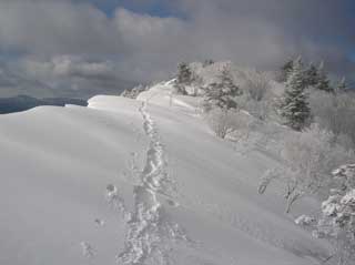 - 寒波襲来で 一気に気温が下がり 新雪が積もった。クラスト面の上の新雪で あまり歩きやすい状態ではなった。