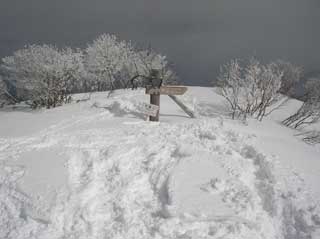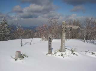 矢筈山頂 「マイナス11.5度 3m 風は弱い。曇り 石堂山 サガリハゲ 黒笠山などが見える。」