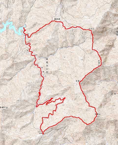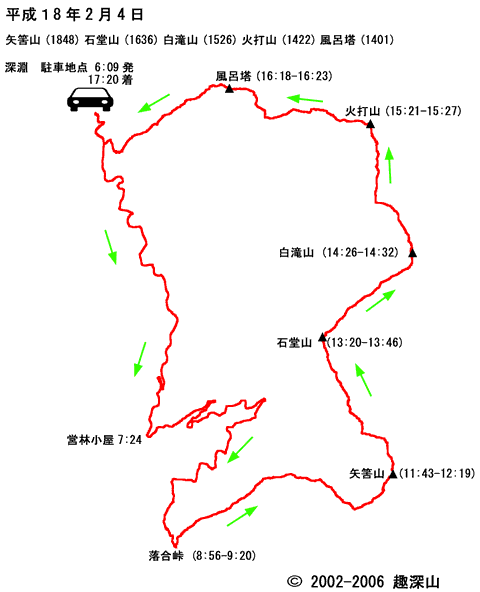 深淵 駐車地点 6:09 --落合峠 (8:56-9:20) -- 矢筈山 (11:43-12:19)-- 石堂山 (13:20-13:46) -- 白滝山 (14:26-14:32)--火打山(15:21-15:27)-- 風呂塔(16:18-16:23) -- 深淵神社 17:14--- 深淵駐車地点 17:20