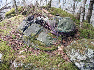途中 13年前の平成5年8月に救出された 道迷い遭難者が残した、 残置ザック3個のある 地点を通過。