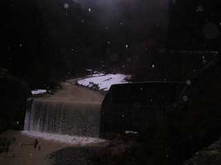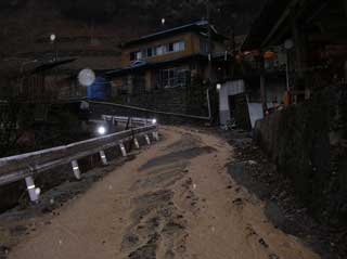 夜半から かなり強い雨が降り続いているようで、増水した片川に沿って つるぎ町の 木地屋赤松線を行くと、雨足は強くなり、木地屋の最終民家付近では、路面全体に、激しく泥流が流れていた。