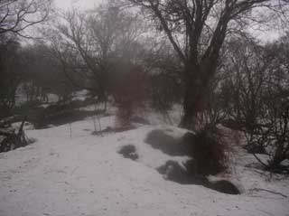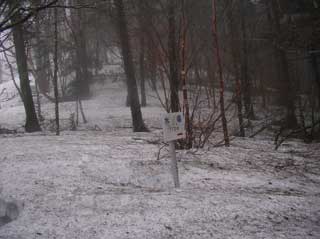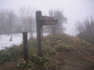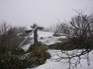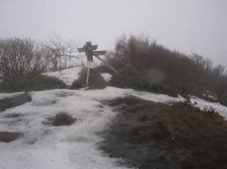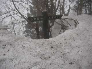 矢筈山頂 「プラス7.5度。6−7m 雨 ガス。 三角点が雪の中から出てきた。」
