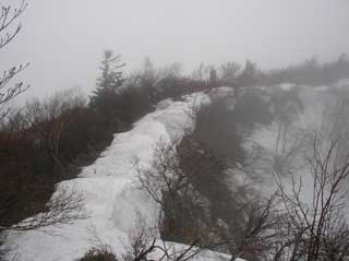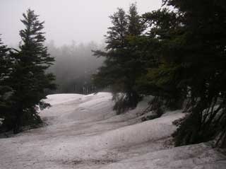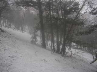 石堂山から 白滝山へ向かうと だんだん雪は少なくなっていく。雨もやむが、ガスで 視界はきかず。