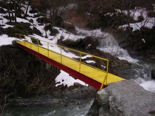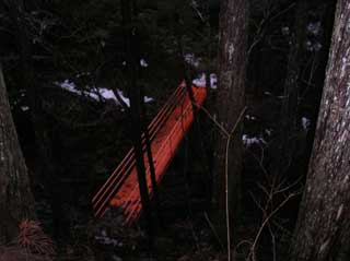 結局安全策をとり、 きちんとした橋のあるところ以外での徒渉はあきらめ、全面通行止めのところから 赤い橋を使って右岸に渡り 尾根に取り付き、 稜線を目指す。