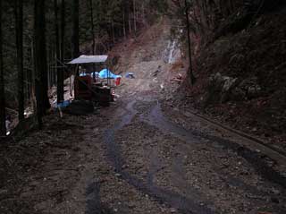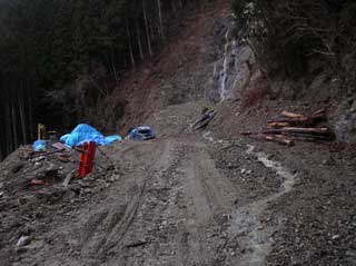 木地屋の林道へ降り立ち 歩いていくと 山腹崩壊箇所では流れ出した土砂が路面に 大きくうずたかく 堆積していた。