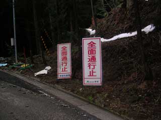 この先の山腹崩壊箇所から 土砂と泥流が ともに流れ出ているためで、全面通行止め標識のあるあたりなど 駐車するどころでない状態だ。