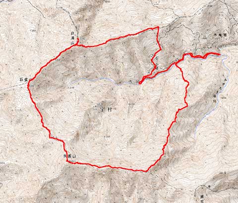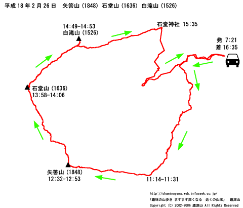 木地屋 駐車地点 7:21 --縦走路 (11:14-11:31) -- 矢筈山(12:32-12:53)--- 石堂山 (13:58-14:06)-- 白滝山 (14:49-14:53) --石堂神社 15:35 -- 木地屋駐車地点 16:35