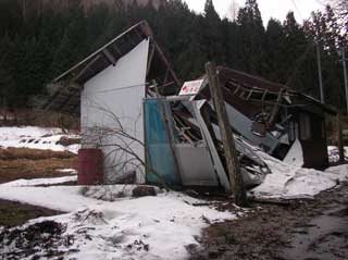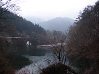 ダムは満水 深淵 大雪の痕 深淵 まだ雪深い 春の兆し 落合峠発電用風車が激しく回る 落合峠から矢筈山への稜線 サガリハゲ分岐標識 サガリハゲ分岐標識付近 鞍部付近 ここで稜線へ出る 矢筈山が見えてきた 矢筈山山頂 矢筈山山頂 矢筈山からの下り 矢筈山北側稜線 木が大雪で曲がっている 水場標識 石堂山山頂 石堂山近く五号標識 お塔石方面少しガスが切れた 石堂山西側雪原 変わった形の木 徒渉地点 林道へ出ると4WDの轍