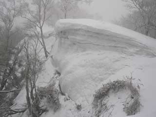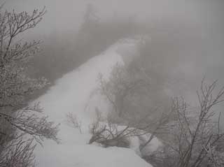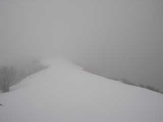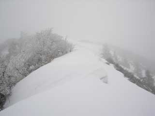 雪庇の雪壁が連なるが、途切れたところで稜線に戻ると、