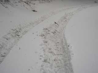 ウッスラついた4WDの轍は、新雪が詰まっていて歩きにくい。