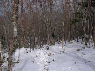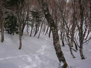 ふるさと林道阿佐名頃線を歩き、三嶺北西尾根へ 作業道から取り付く。 登ると新雪が多くなってくる。