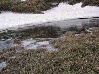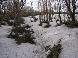 登っていくと上の方では部分的に残雪の上を歩くようになるところがある。
