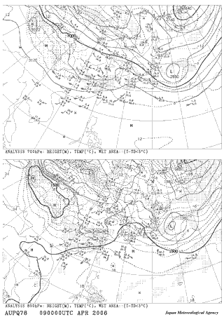 平成18年4月9日 9:00地上天気図 平成18年4月9日9:00高層天気図700hpa 850hpa