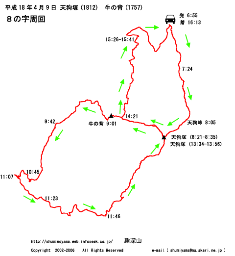 HOME > 山行記録 >無雪期>天狗塚(1812)牛の背(1757)8の字周回>平成18年4月9日