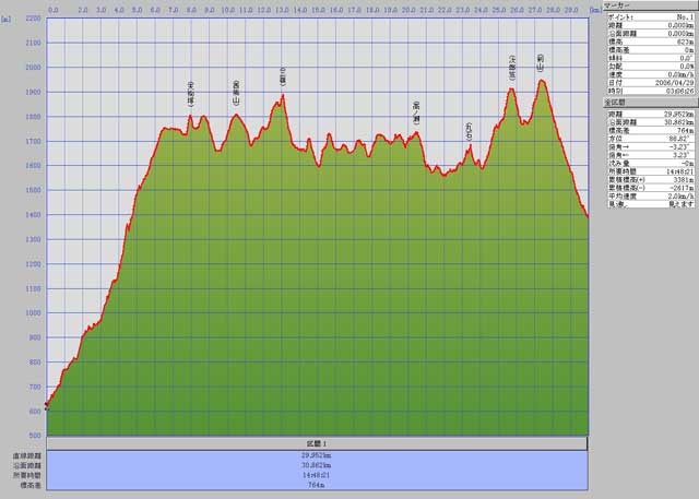 etrex-legend-J で計測 累計沿面歩行距離 30.862km 累積標高差 +3381m
