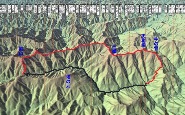 牛ノ背(1757)天狗塚(1812)西熊山(1815)三嶺(1893)高ノ瀬(1741)丸石(1683)次郎笈(1929)剣山(1955)