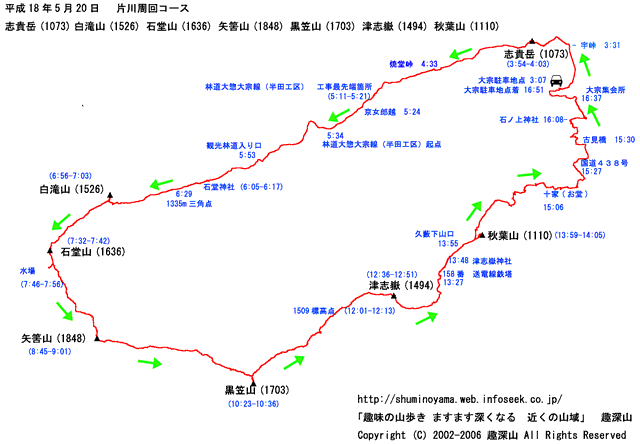 HOME > 山行記録 >無雪期>志貴岳(1073)白滝山(1526) 石堂山(1636) 矢筈山(1848) 黒笠山(1703) 津志嶽(1494) 秋葉山(1110)>平成18年5月20日
