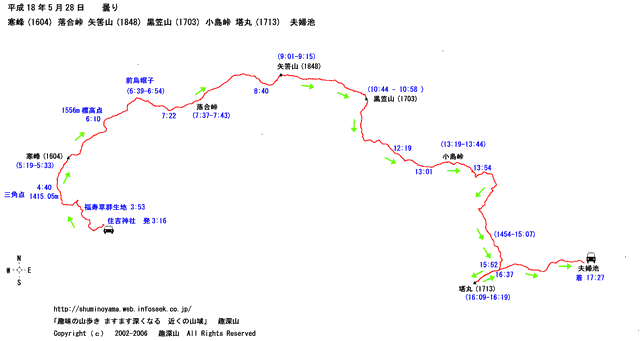 HOME > 山行記録 >無雪期>寒峰(1604) 落合峠 矢筈山(1848) 黒笠山(1703) 小島峠 塔丸(1713) 夫婦池 > 平成18年5月28日