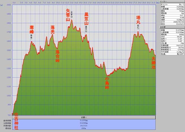 寒峰(1604) 落合峠 矢筈山(1848) 黒笠山(1703) 小島峠 塔丸(1713) 夫婦池