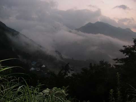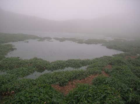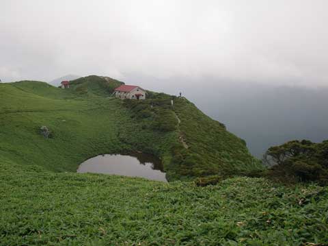 三嶺 「17.0度 3m 南風 ガス。時折 ガスが切れ三嶺ヒュッテが見える。」