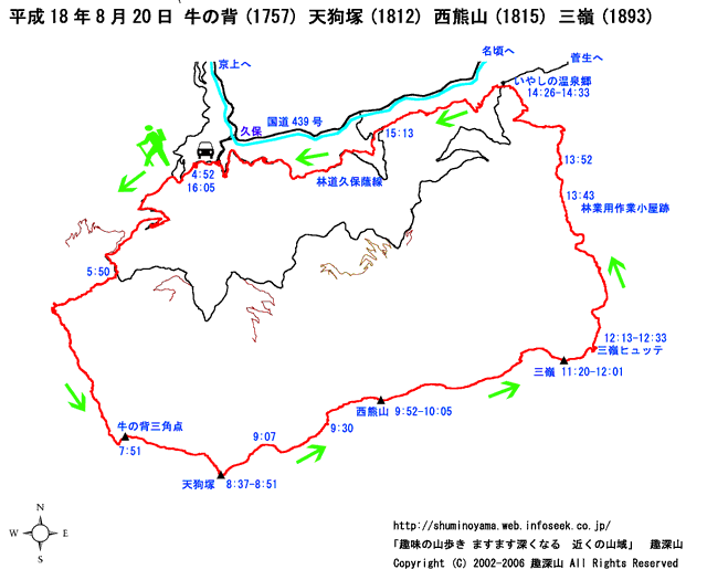 久保駐車地点 4:52 --砂防堰堤 5:50 -- 牛の背三角点 7:51 --- 天狗塚山頂 (8:37-8:51) -- 天狗峠 9:07 -- お亀岩 9:30 -- 西熊山 (9:52-10:05) -- 三嶺 (11:20-12:01) --- 三嶺ヒュッテ付近 (12:13-12:33)----菅生 下山道分岐 12:33 ---林業用作業小屋跡 13:43 --モノレール駅 13:52 --- いやしの温泉郷 (14:26-14:33) -- 林道久保蔭線 15:13 --久保駐車地点 16:05