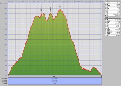 断面図1 累計歩行距離 26.079km 累計標高差 2464m 地図上の高度で計算