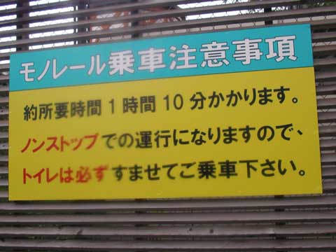いやしの温泉郷にある、 モノレール乗車の際の注意事項の看板。先週は 見かけなかった。