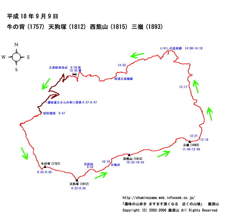久保駐車地点 6:30----讃岐富士さんの車に便乗(6:37-6:47)----砂防堰堤 6:47 ---- 牛の背三角点 (8:45-8:49) --- 天狗塚山頂 (9:22-9:35) ---- 天狗峠 9:52 -- お亀岩 10:10 -- 西熊山 (10:32-10:43) -- 三嶺 (11:49-12:09) --- 三嶺ヒュッテ 12:19----菅生 下山道分岐 12:21 ---林業用作業小屋跡 13:17 -- いやしの温泉郷 (14:00-14:18) -- 林道久保蔭線 14:55 --久保駐車地点 15:45