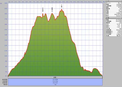 累計距離 26.414km 累計標高差 2358m 地図上の高度で計算