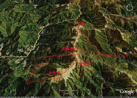 西山林道 駐車地点 5:11---西山林道イザリ峠登山口 5:24 ---1476標高点 5:58---天狗峠 西山林道下山口 (6:34-6:37)---天狗峠綱附森分岐 6:40--お亀岩6:53--お亀岩避難小屋 6:55---徒渉地点 7:29--- 八丁ヒュッテ 7:47 ---ヌスビト岩 8:32------三嶺 (10:20-10:55)----西熊山( 11:54-12:10 )---お亀岩12:28---天狗峠綱附森分岐12:48--天狗峠西山林道下山口 12:52--天狗塚 (13:06-13:38)--牛ノ背三角点 14:04----林道 15:03---西山林道駐車地点 15:25