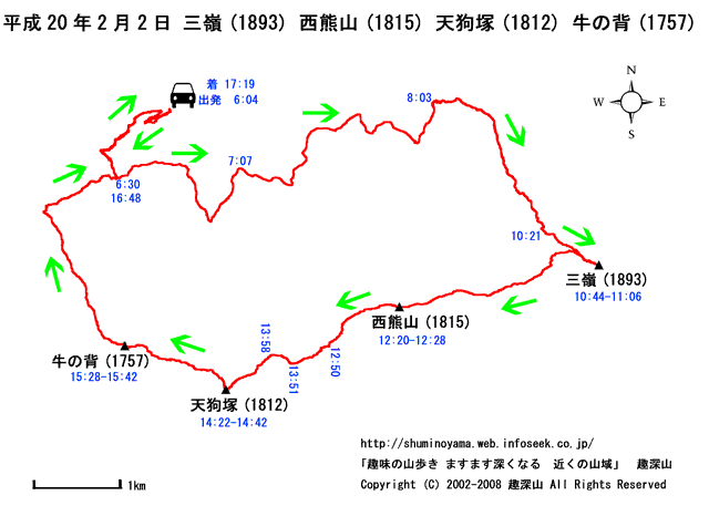 HOME > 山行記録 >積雪期 三嶺(1893) 西熊山(1815) 天狗塚(1812) 牛ノ背(1757) > 平成20年2月2日