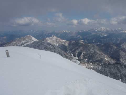 矢筈山山頂 「マイナス10.7度 西風5m 曇り しばらくして ガスがとれ 三嶺 天狗塚 剣山 次郎笈などが 見える。祖谷谷は真っ白。」