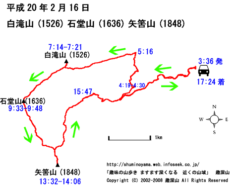 HOME > 山行記録 >積雪期>矢筈山(1848)石堂山(1636)白滝山(1526) つるぎ町 > 平成20年2月16日