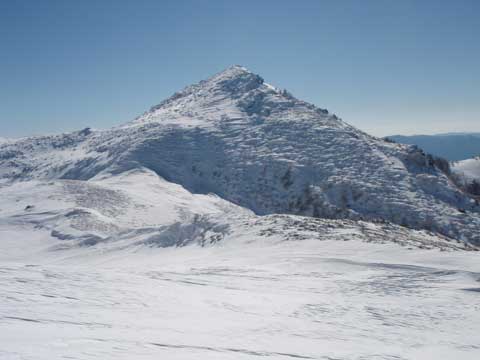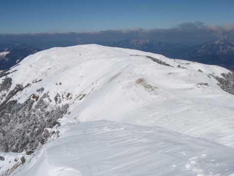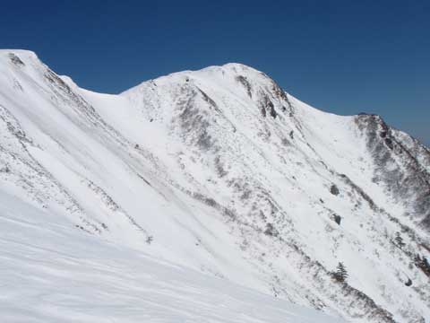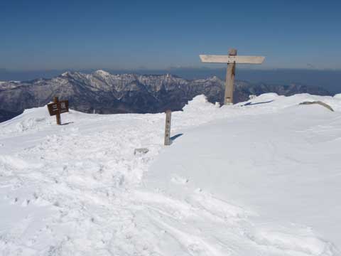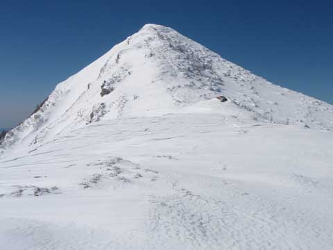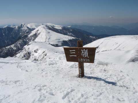 三嶺山頂は風弱く、快晴。長居をしていると、突然、山頂南面で雪が崩れた。