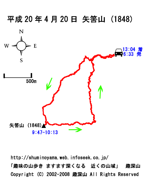 木地屋 林道大惣線駐車地点 6:33 ---- 矢筈山 (9:47-10:13)----木地屋 林