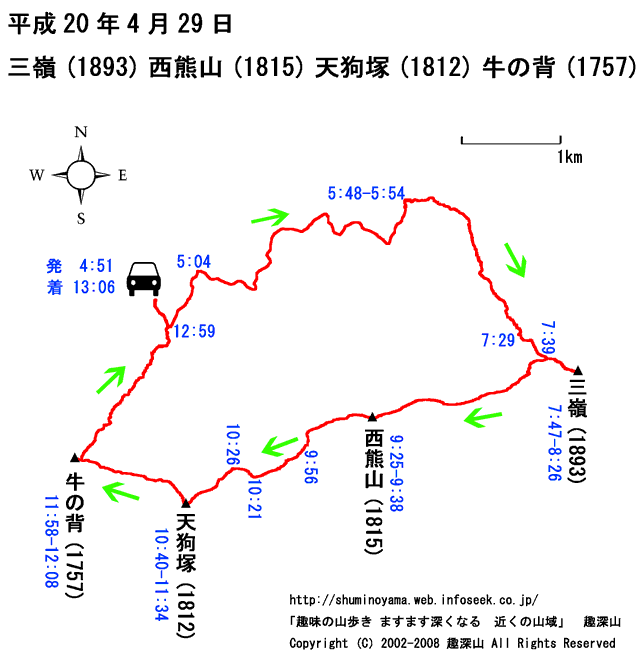 0:40-11:34 )--牛の背三角点 (11:58-12:08) ----西山林道 12:59 -----