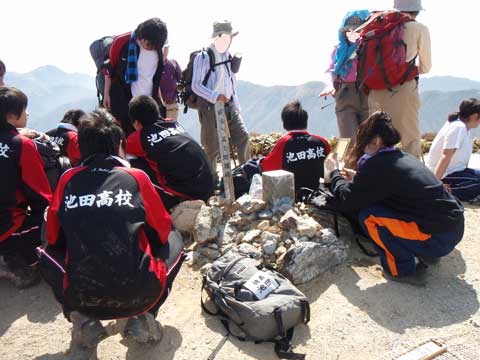 年に何回もない珍しいこと。いつもは中高年でにぎわう山頂が この日 三嶺 山頂滞在者の平均年齢が若返った。