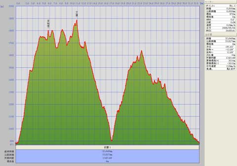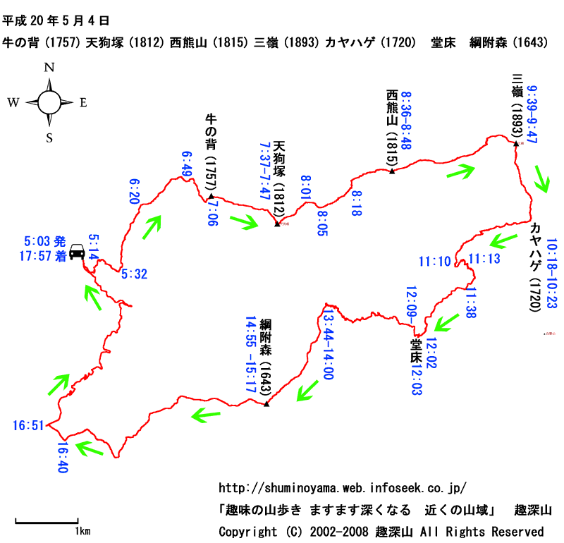 林道樫尾阿佐線 3.5キロポスト付近 駐車地点 5:03 --- オコヤトコ 5:14 --- 尾根へ上がる 5:32 --1486標高点 6:20 --縦走路 6:49 --牛の背三角点 7:06 --- 天狗塚 (7:37-7:47) --天狗峠西山林道下山口 8:01 --天狗峠綱附森分岐 8:05 --- お亀岩 8:18 -- 西熊山 (8:36-8:48) -- 三嶺 (9:39-9:47)---- カヤハゲ (10:18-10:23)--フスベヨリ分岐 11:10 --ケヤキザコ・韮生越 分岐 11:13 ---さおりが原 11:38--堂床 さおりが原登山口標識 12:02--堂床 吊橋 12:03---堂床 綱附森登山口標識 12:09---稜線 堂床下山口標識 (13:44-14:00)--- 綱附森 (14:55 -15:17)--綱附森登山口 16:40-- 矢筈峠 16:51 -- 林道樫尾阿佐線 3.5キロポスト付近 駐車地点 17:57