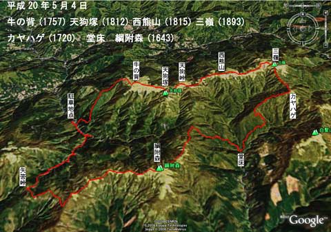 HOME > 山行記録 >牛の背(1757)天狗塚(1812)西熊山(1815)三嶺(1893)カヤハゲ(1720) 堂床 綱附森(1643) > 平成20年5月4日