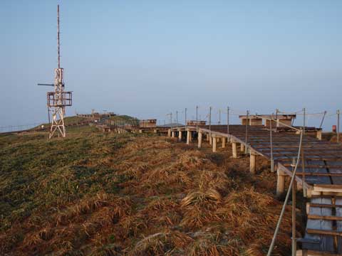 剣山 「4.4度 5m 西風 晴れ 三嶺 塔の丸 見える。すこし もやがかかっている」